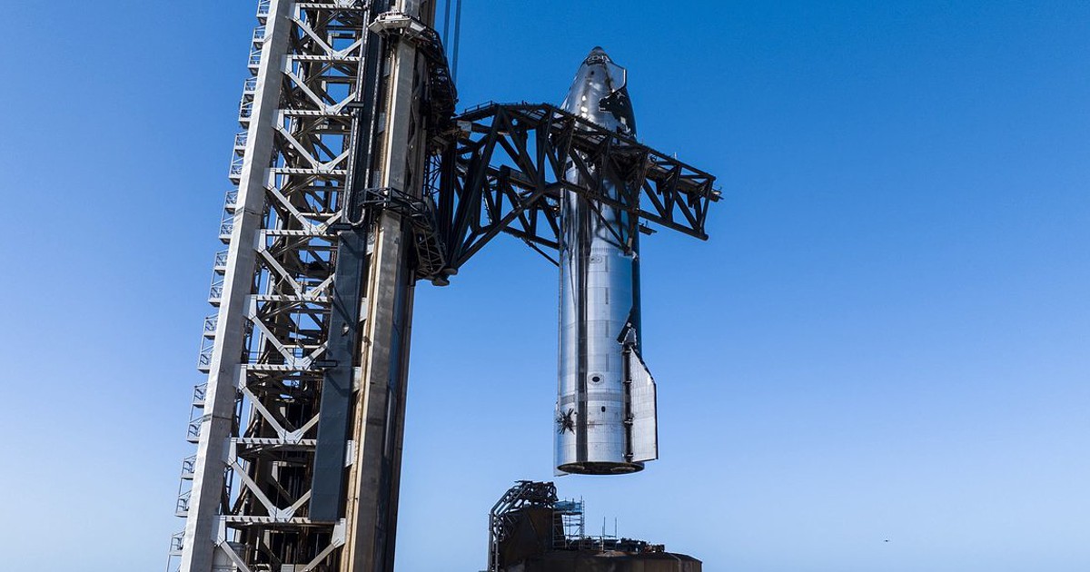 foguetão, com uma altura de 121 metros, é composto por duas partes: o propulsor Super Heavy, equipado com 33 motores Raptor e que já foi reutilizado, e um estágio superior, composto por uma nave espacial chamada Starship.