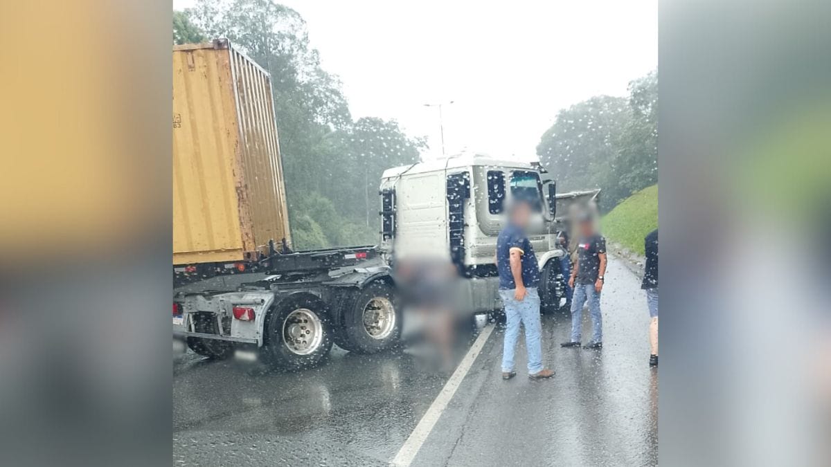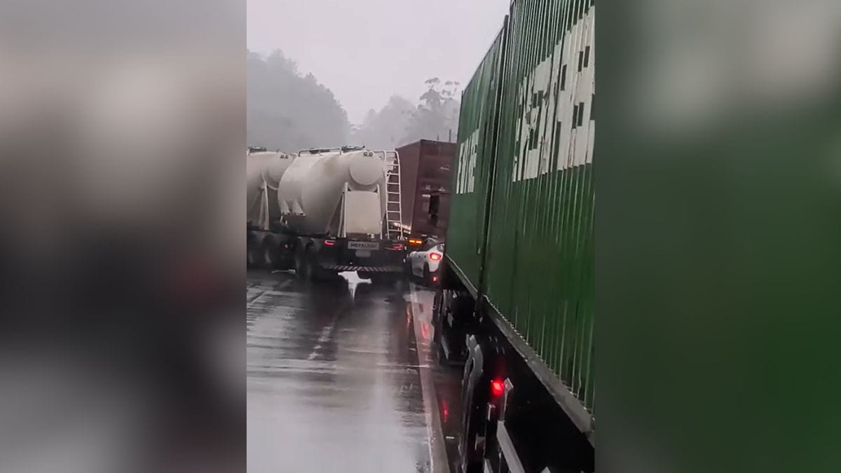 O primeiro acidente aconteceu às 16h10min no Km 19,5 da BR-101. Conforme a Arteris, uma carreta colidiu em uma defesa na pista sentido Curitiba. Não houve registro de outros veículos envolvidos no acidente.