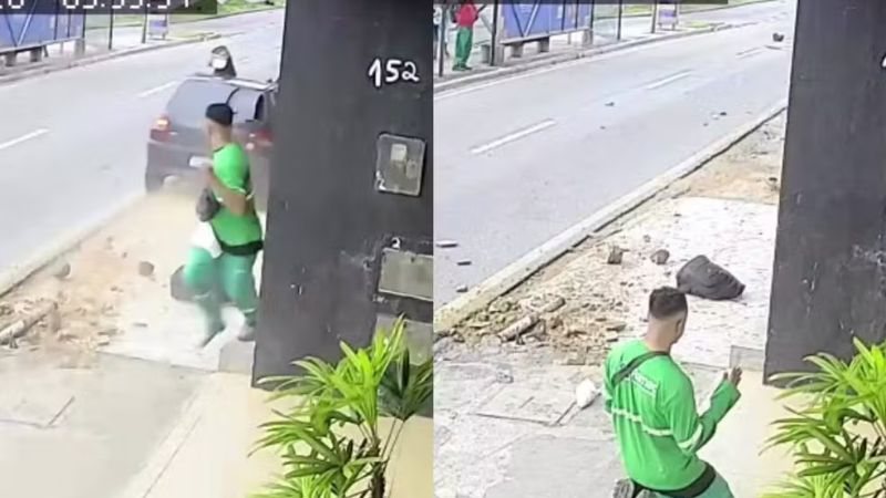 Uma câmera de segurança registrou o momento em que o agente de limpeza Erick Danilo Santos, de 26 anos, quase foi atropelado por um carro desgovernado na Avenida José Carlos Silva, em Aracaju (SE), no último sábado (20).