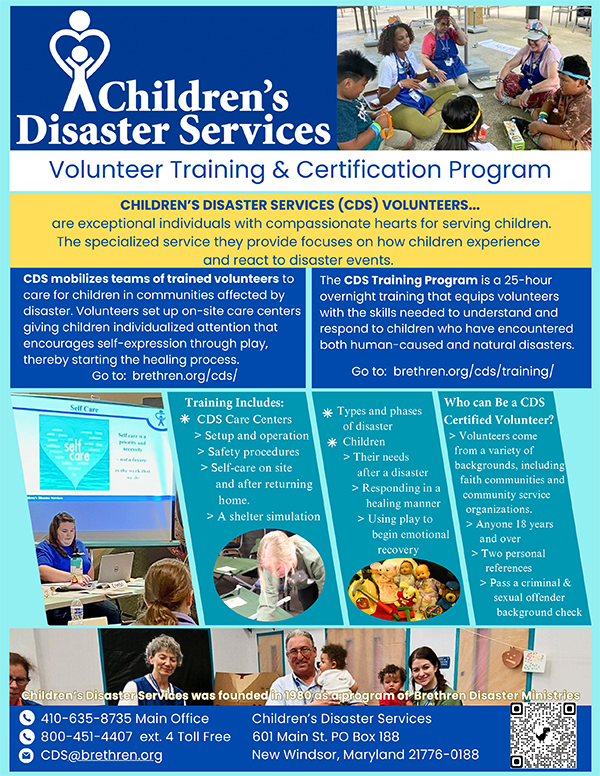 Os voluntários do CDS são pessoas excepcionais, com corações compassivos que atendem crianças. O serviço especializado que prestam concentra-se em como as crianças vivenciam e reagem a desastres. O programa de treinamento do CDS é um treinamento de 25 horas que equipa os voluntários com as habilidades necessárias para compreender e responder a crianças que sofreram desastres naturais e causados por humanos. Saiba mais e inscreva-se para um treinamento em www.brethren.org/cds ou ligue para 410-635-8735.