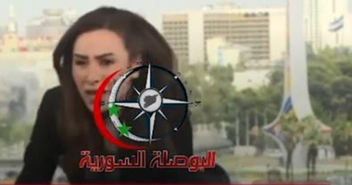 A apresentadora de TV se assustou no momento em que o complexo do Exército Sírio foi atingido. Veja: