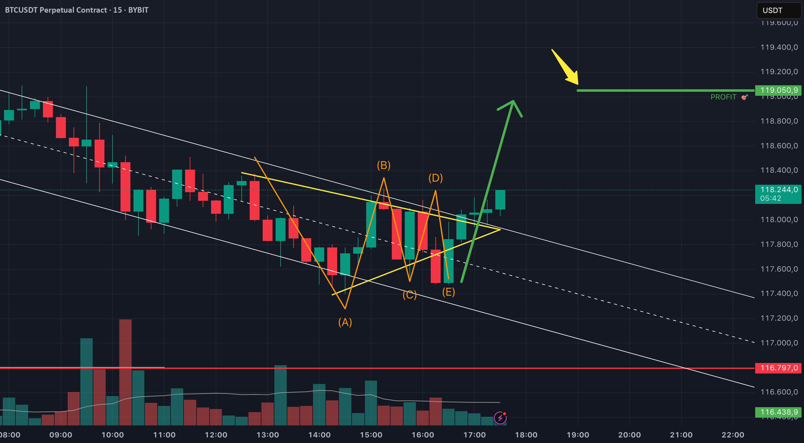 Alvo de lucro em 119.043,9 USDT, calculado possivelmente pela projeção da base do triângulo simétrico.