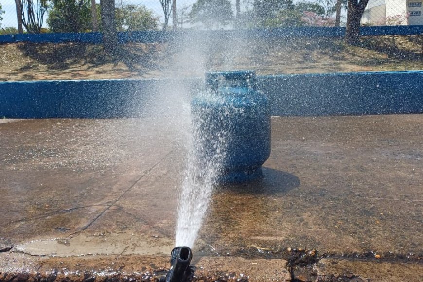 A situação era crítica: o calor intenso provocou o rompimento da válvula de alívio de um dos botijões — estágio que antecede a explosão.