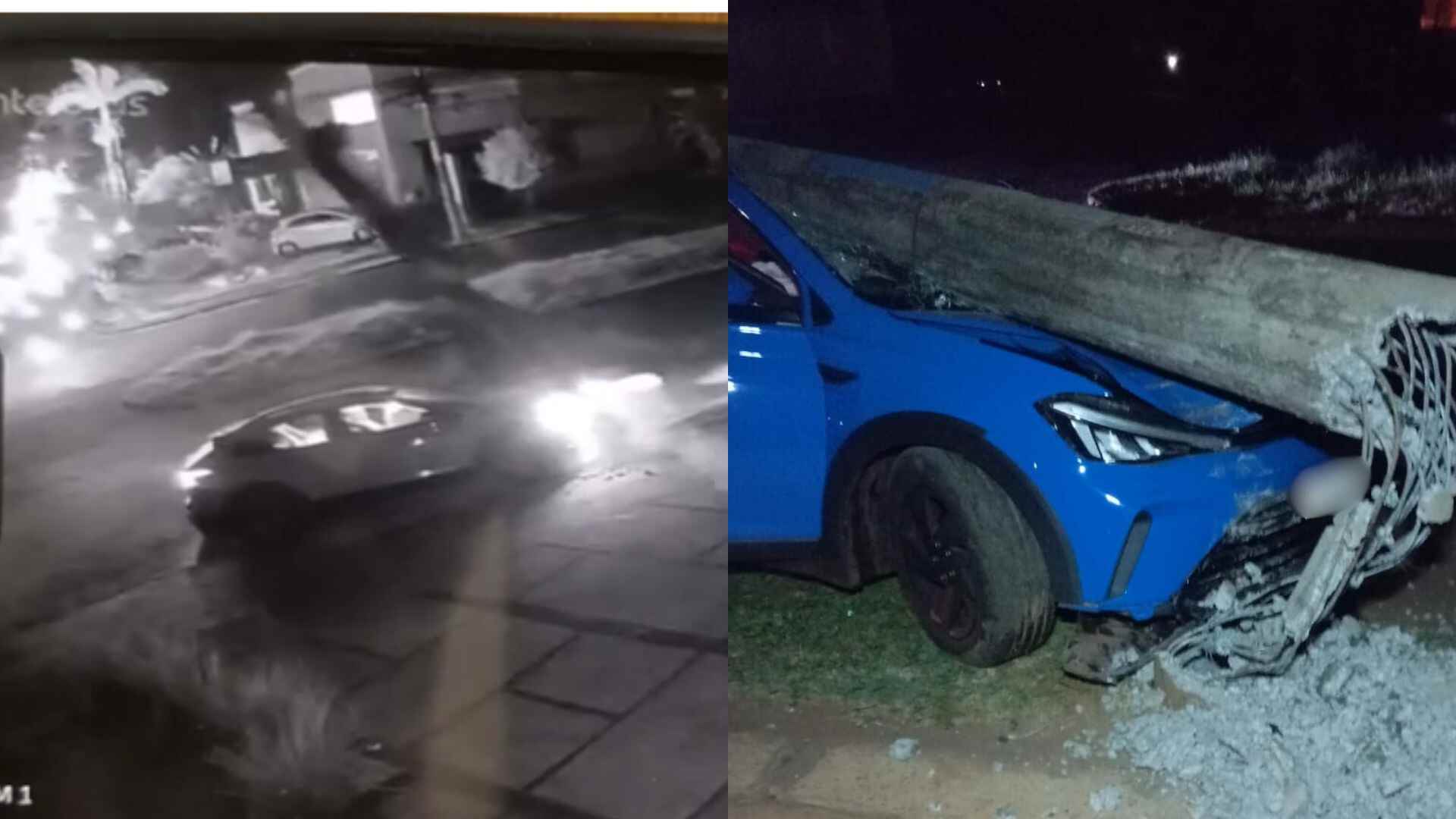 Câmeras de segurança flagraram o exato momento em que um veículo, modelo VW NIVUS, colide com um poste no bairro Nova Campo Grande, deixando parte do bairro sem energia. O acidente ocorreu na noite deste sábado (27), entre a Avenida 9 e Rua 60.