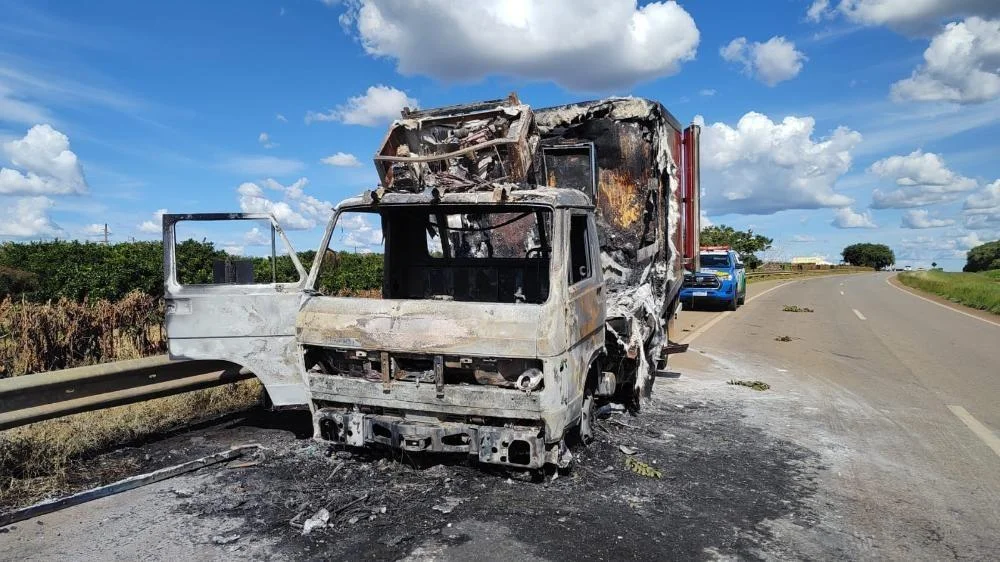 O fogo destruiu completamente a cabine e parte do baú. A corporação atuou no combate às chamas, mas não informou as possíveis causas de incêndio.