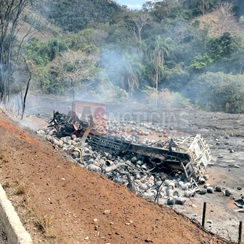 SANTA MARIA DE ITABIRA/FERROS(MG)– Na manhã deste sábado, 27 de setembro de 2025, por volta das 8h, um caminhão carregado com botijões de gás tombou em uma ribanceira no km 496 da MGC-120, próximo ao trevo de acesso a Passabém. O acidente provocou explosões e um incêndio que atingiu a vegetação às margens da rodovia.
