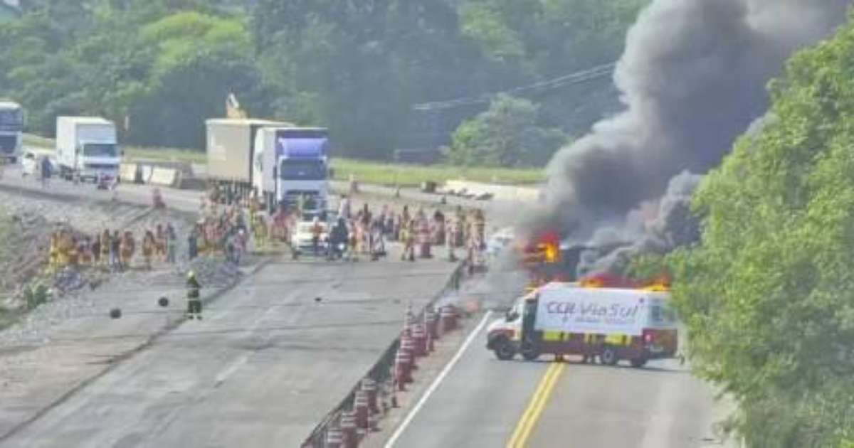 Equipes do Corpo de Bombeiros, Samu, PRF e CCR ViaSul foram acionadas e permanecem no local, isolando a área e atuando no controle das chamas. A rodovia foi totalmente bloqueada para garantir a segurança dos condutores enquanto os trabalhos de emergência continuam.