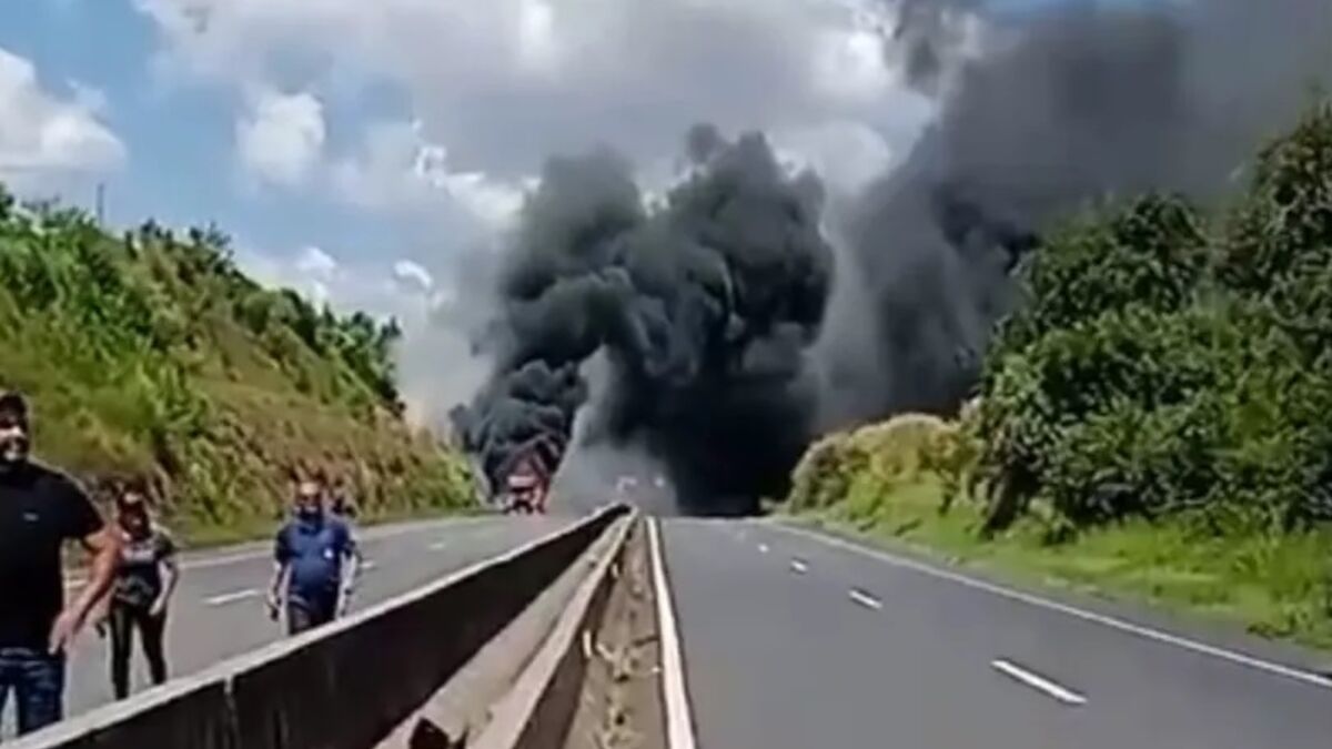 Um incêndio em um caminhão na tarde deste sábado (22) provoca o bloqueio total da BR-376, em Tibagi, nos Campos Gerais. O acidente aconteceu na altura do km 419 da rodovia.