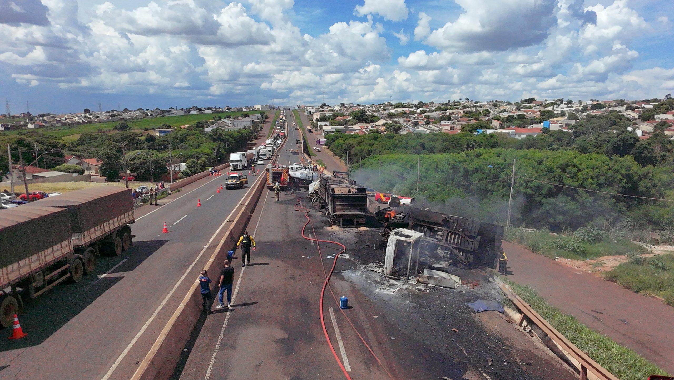 A Polícia Rodoviária Federal informou que será necessário realizar o resfriamento e a retirada da carga e depois fazer o desmembramento do caminhão para remoção. O trecho da rodovia ficou interditado e ainda não há previsão para liberação do fluxo.