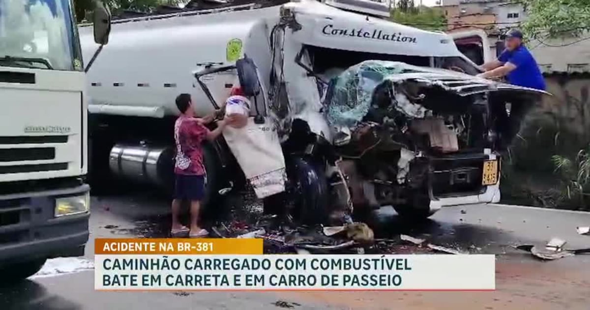 População é flagrada furtando combustível que vazou de caminhão após acidente na BR-381, no bairro Vila da Luz, na região Nordeste de Belo Horizonte. Uma batida entre dois caminhões interditou a rodovia pelo risco de explosão. O acidente causou graves reflexos no trânsito e gerou quilômetros de congestionamento. A rodovia segue interditada até que seja feito o transbordo da carga para um novo veículo e limpeza completa da pista.