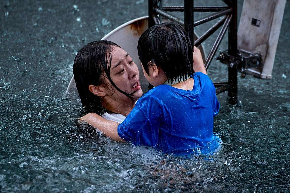 Sem perder tempo, A Grande Inundação já começa com a inundação em franco andamento, com a cientista de inteligência artificial Gu An-na (Kim Da-mi), recém enviuvada, acordando, recebendo uma ligação de que ela será resgatada em breve por uma voz que desconhece e fugindo de seu apartamento no terceiro andar com seu filho pequeno diabético Ja-in (Kwon Eun-seong) em direção ao teto do gigantesco conjunto habitacional onde vive. Enquanto a água não para de subir, ela se encontra com seu suposto salvador, Son Hee-jo (Park Hae-soo), que explica que um asteroide atingira o Polo Norte há três horas e que, por ela ser a única esperança de sobrevivência da raça humana, ela será levada de helicóptero para uma estação espacial secreta. Essas informações são jogadas no colo do espectador sem preocupação alguma com a construção de contexto, mas com a promessa clara de que tudo será eventualmente explicado, o que de certa forma funciona para atiçar a curiosidade de um lado e, de outro, para não desviar o foco da história de sobrevivência que vai sendo contada andar por andar.