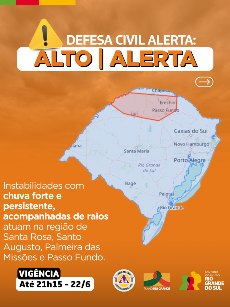 Defesa Civil alerta para condição de ALERTA com instabilidades associadas a chuva forte e persistente, acompanhadas de raios atuam na região de Santa Rosa, Santo Augusto, Palmeira das Missões e Passo Fundo. Risco ALTO de alagamentos. Válido até 21h15 do dia 22 de junho. Evite áreas de risco. Emergência ligue 190/193.