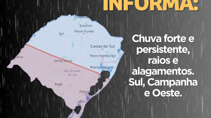 Defesa Civil informa: Chuva forte e persistente, raios e alagamentos. Emergência ligue 190/193.