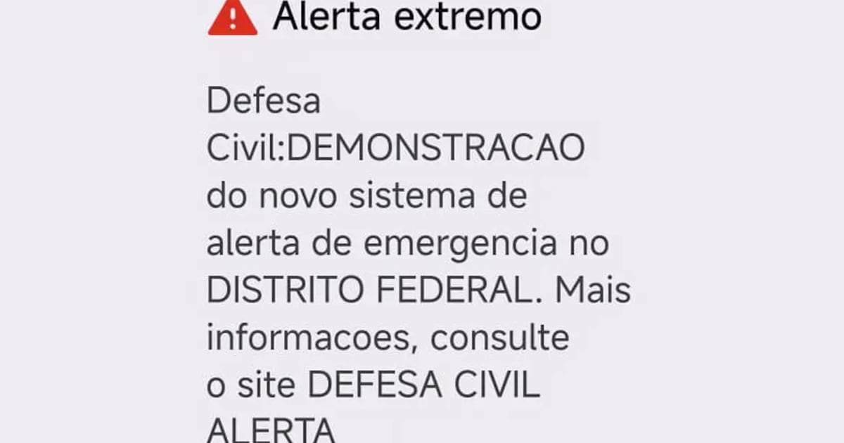“Defesa Civil: Demonstração do novo sistema de alerta de emergência no Distrito Federal. Mais informações, consulte o site Defesa Civil Alerta”, dizia a mensagem.