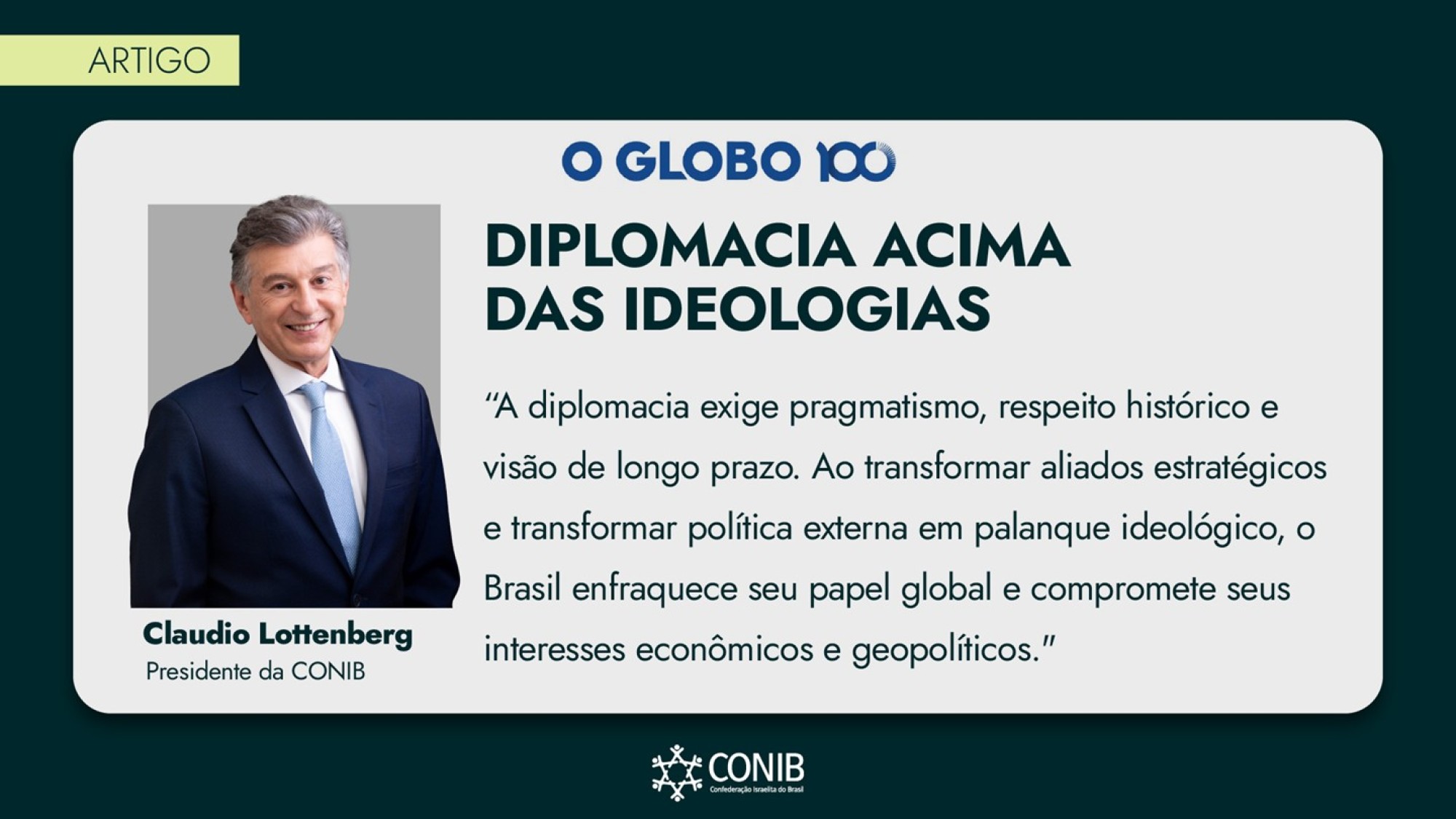 Em artigo em O Globo deste domingo (31), o presidente da CONIB, Claudio Lottenberg, aborda a crise nas relações entre Brasil e Israel e alerta para “uma crescente contaminação da política externa brasileira por uma visão ideológica estreita”. “Ao ignorar aliados estratégicos e transformar política externa em palanque ideológico, o Brasil enfraquece seu papel global e compromete seus interesses econômicos e geopolíticos”. Leia a seguir a íntegra do artigo:
