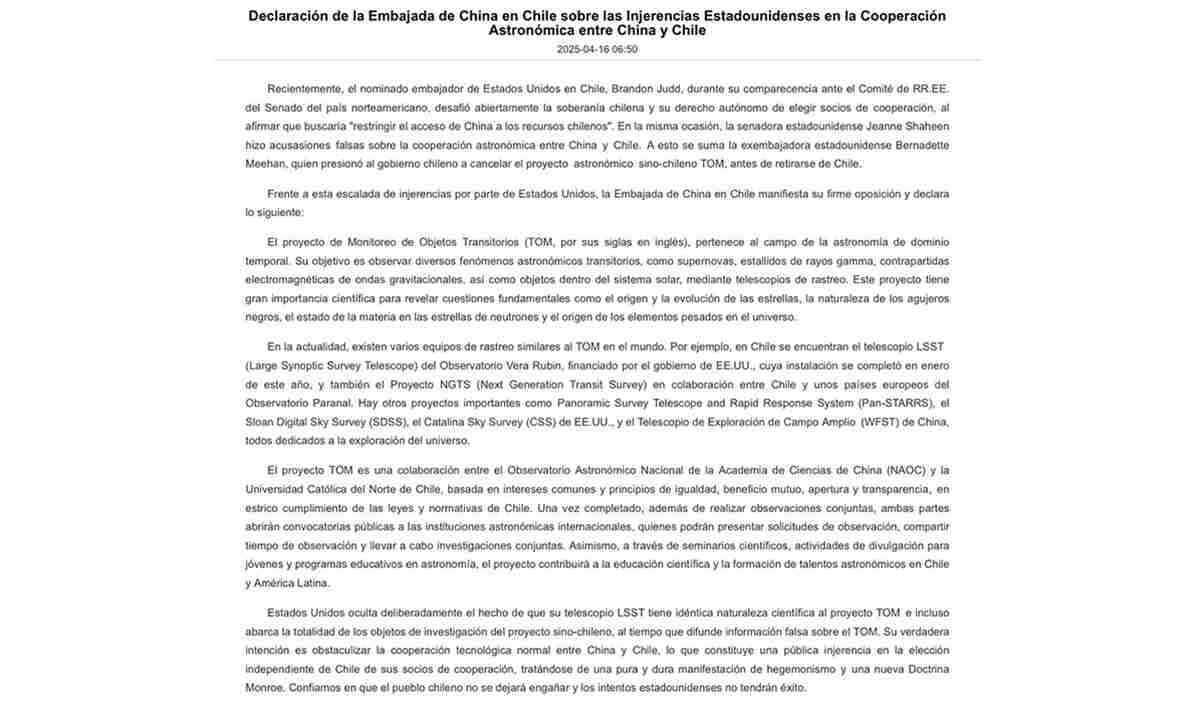 A Embaixada da China no Chile se opôs firmemente na quinta-feira às recentes ações e declarações dos EUA sobre um projeto de cooperação astronômica China-Chile, condenando-as como “comportamento totalmente novo da Doutrina Monroe”.