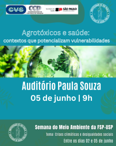A Semana do Meio Ambiente, promovida pelo Departamento de Saúde Ambiental da FSP-USP, contará com extensa programação. O debate sobre agrotóxicos é uma iniciativa conjunta entre a Faculdade e o Centro de Vigilância Sanitária da Secretaria de Estado da Saúde de São Paulo (SES-SP), com o apoio do Departamento de Política, Gestão e Saúde da FSP-USP.