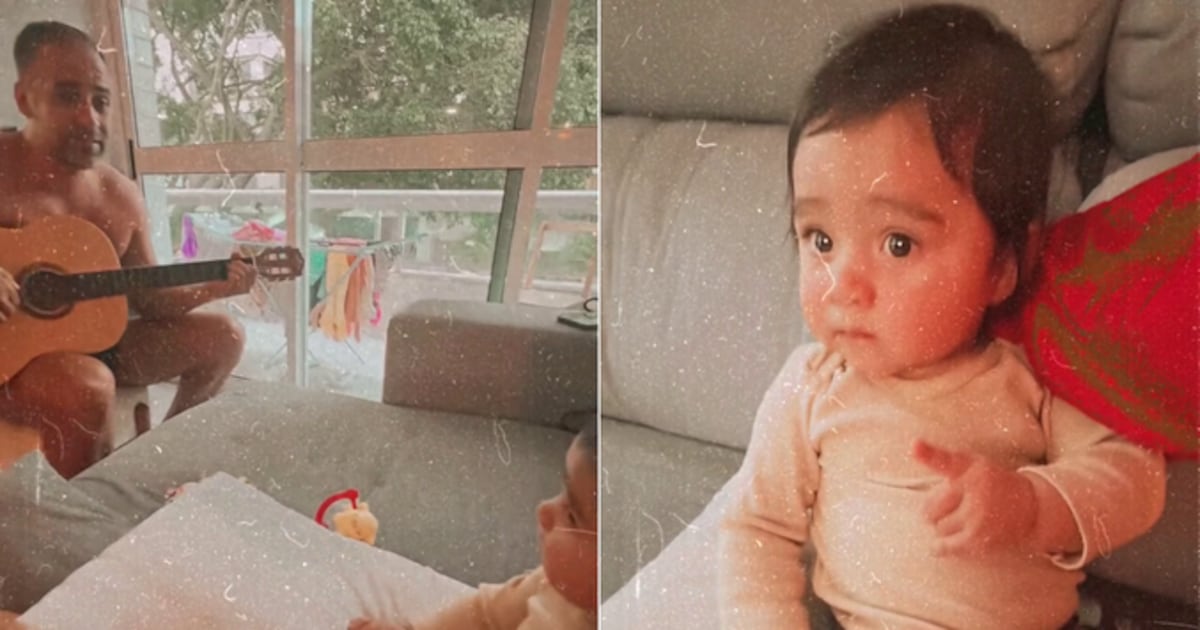 O ator tocou e cantou uma música para a esposa Karen Júlia e para a filha Pérola, de oito meses.