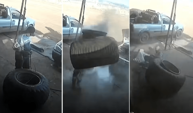 A explosão de um pneu causou um grande susto em uma borracharia de Porteirão, no sul de Goiás, na última quinta-feira (18). Apesar da força da detonação, que arremessou um borracheiro no chão, ele não sofreu nenhum ferimento. O momento do acidente foi registrado por uma câmera de segurança.