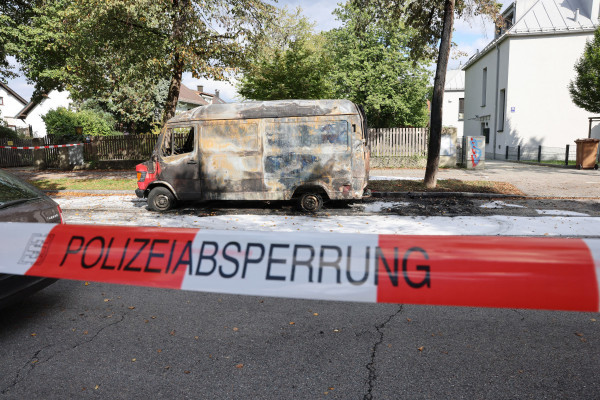 Policiais inspecionam uma van incendiada estacionada na rua perto do local onde explosões foram ouvidas (ALEXANDRA BEIER / AFP)