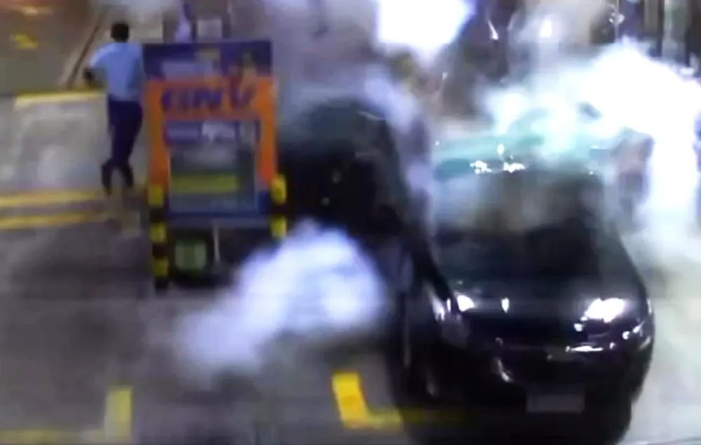 A força da explosão lançou o carro para frente e causou danos à estrutura do teto do posto. A causa do acidente está sob investigação das autoridades para apurar as responsabilidades.