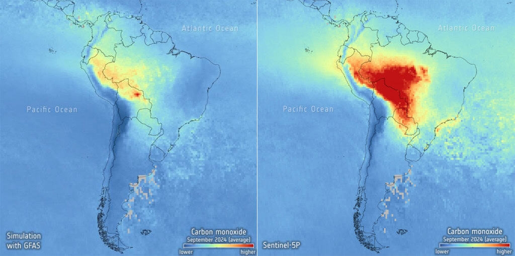 O Sentinel-5P, lançado em 2017, possui o espectrômetro Tropomi, capaz de medir gases como CO, metano e dióxido de nitrogênio com resolução inédita. Isso possibilita monitorar a poluição de incêndios em detalhes e integrar informações sobre vegetação e condições do solo, tornando as estimativas de emissões mais precisas do que os métodos tradicionais.