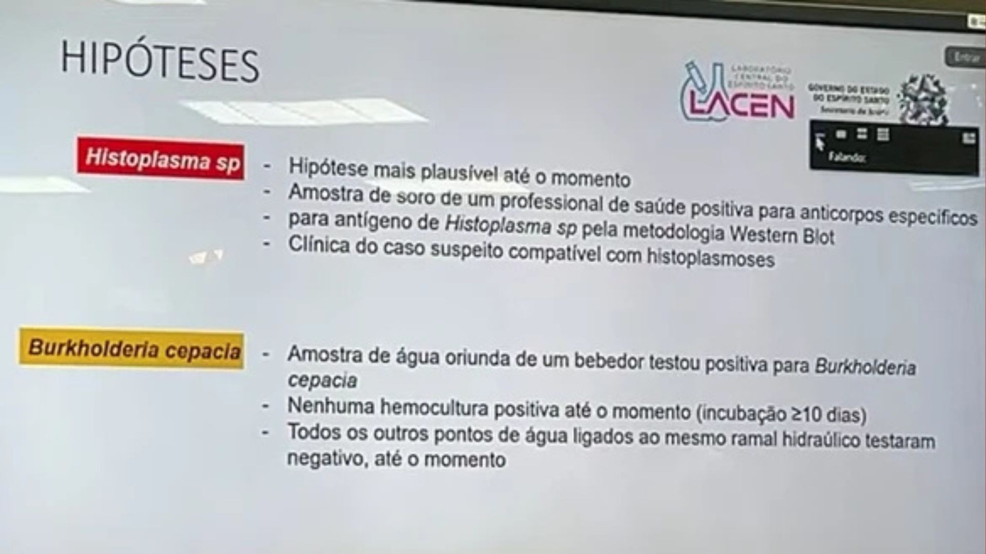 “Nos testes que rodamos na Fiocruz, testes de sangue, onde foram testadas 11 amostas, todas elas de funcionários, em um desses funcionários encontramos esse fungo, o histoplasma. Esse fungo é um fungo normalmente advindo de fezes de morcegos ou aves, como pombos. Esse fungo faz muito sentido nesse investigação por conta dos sintomas do quadro clínico dos pacientes e pelo fato de não haver transmissão entre pessoas”, disse o secretário de Saúde, Tyago Hoffman.