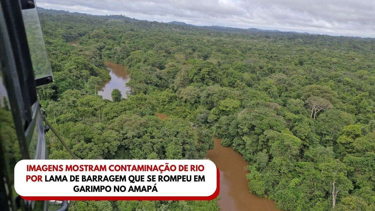 Imagens mostram contaminação de rio por lama de barragem que se rompeu em garimpo no Amapá. Expandir ou colapsar descrição.