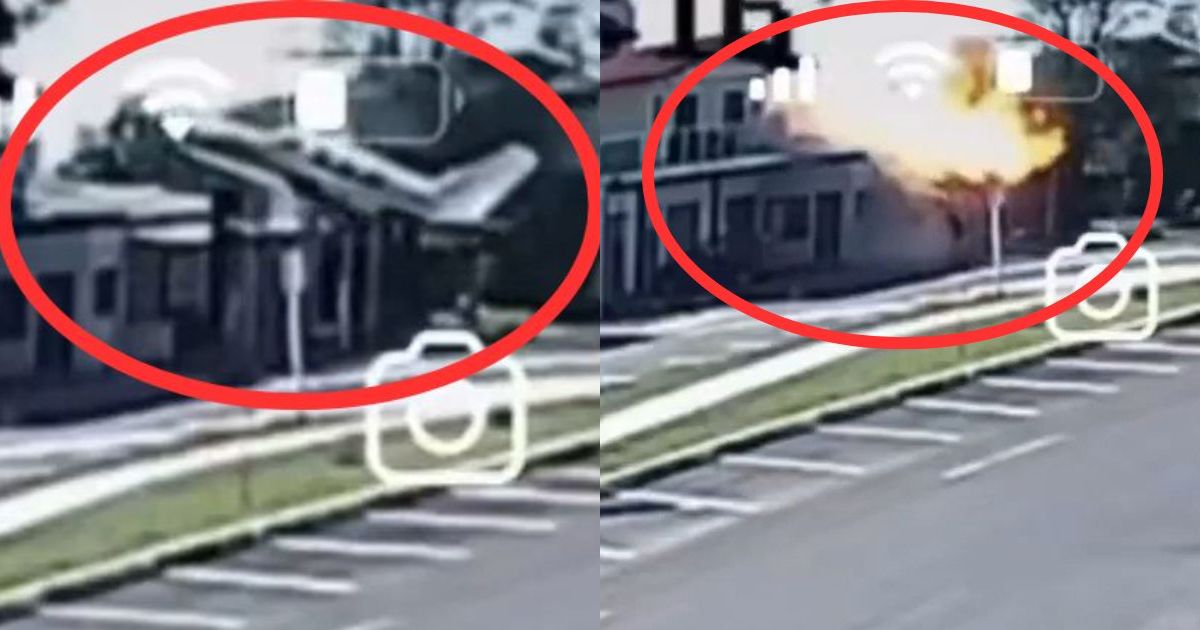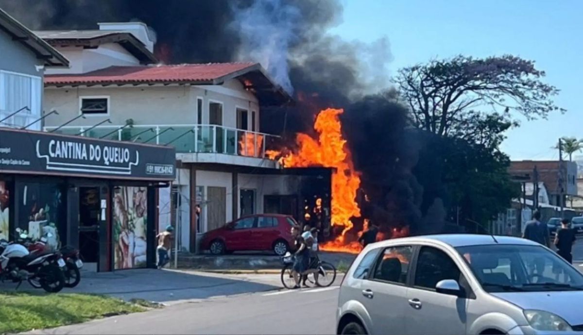 Câmeras de segurança da prefeitura registraram o exato momento da queda. As imagens mostram a aeronave caindo sobre um estabelecimento e causando um incêndio imediato.
