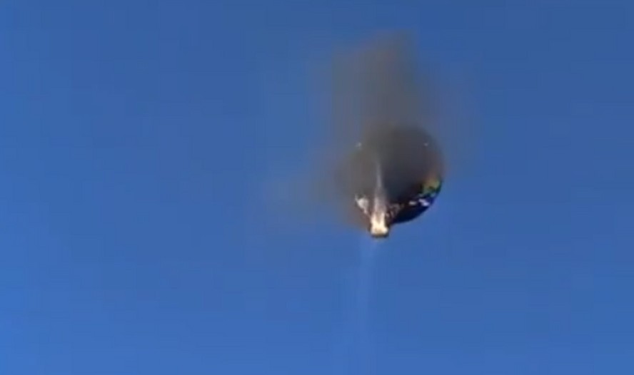 Imagens que circulam nas redes sociais mostram o momento em que o balão perde altitude rapidamente, com chamas visíveis envolvendo parte da estrutura.