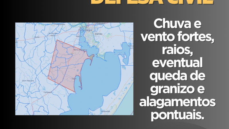 Defesa Civil alerta para chuva e vento fortes, raios, eventual queda de granizo e alagamentos pontuais para a áreas próximas a Barra do Ribeiro e Tapes. Válido até as 21h de segunda-feira, 25 de fevereiro. Emergência ligue 190/193.