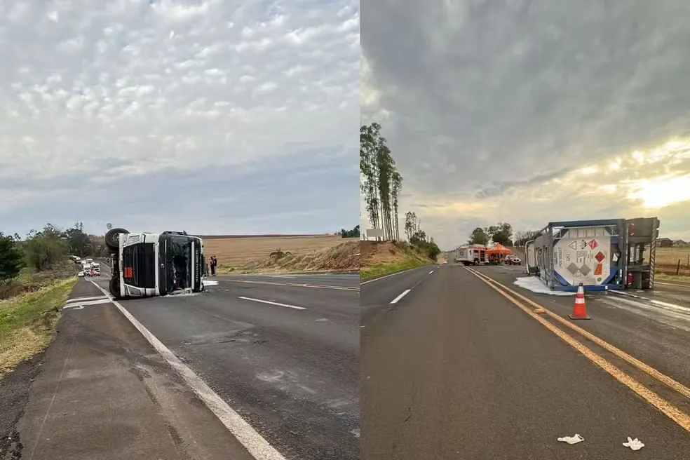 Segundo a Polícia Rodoviária Estadual (PRE), o acidente aconteceu na tarde desta quarta-feira (1º), por volta das 15h. O caminhão estava transportando Ácido Propiônico, que é uma substância corrosiva. O motorista foi socorrido com ferimentos leves e levado para uma unidade de saúde da região.