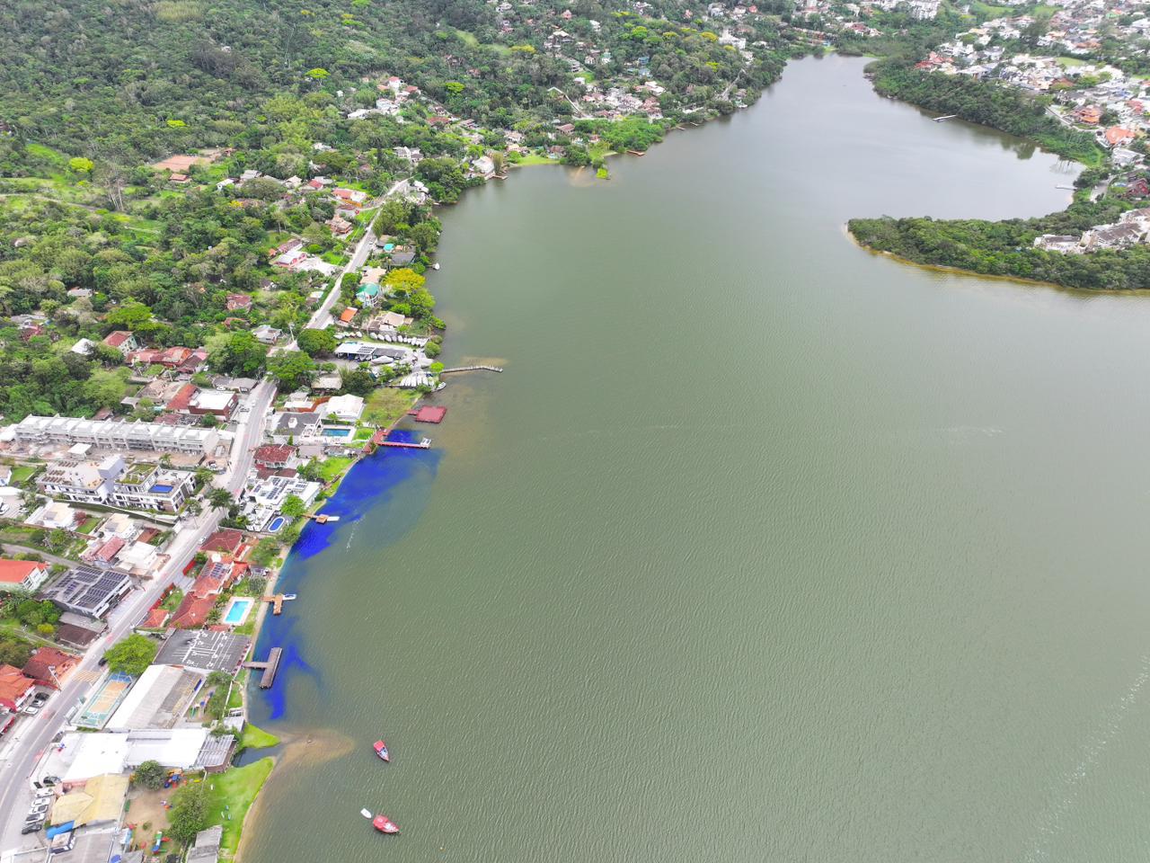 Uma nova mancha apareceu na Lagoa da Conceição, em Florianópolis, na sexta-feira (31). Ela tinha uma coloração azul forte e se localizava na região do Canto da Lagoa. O fenômeno se dissipou ao longo do dia, segundo moradores da região.