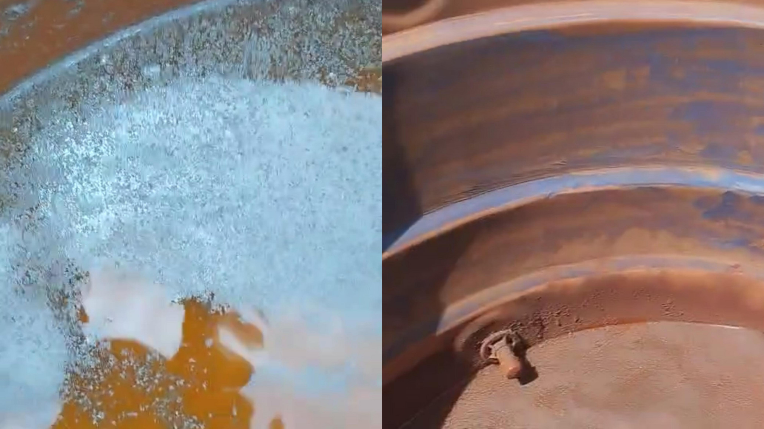 Nas imagens, o morador mostra o interior da caixa d’água de sua residência e afirma que ela está coberta por resíduos semelhantes à ferrugem e à bauxita, matéria-prima utilizada no processo de produção de alumínio. “Isso aqui é puro ferro, minha querida. Olha meu poço. Isso aqui é da água do meu poço”, diz, enquanto aponta para as paredes internas do reservatório, que ele afirma ter precisado lixar manualmente para tentar limpá-las.