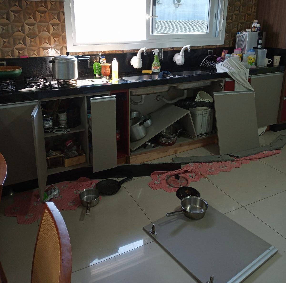 Funcionários de uma empresa próxima ouviram o estrondo e se dirigiram até a residência, encontrando a mulher caída. Durante a avaliação, constatou-se que ela sofreu uma contusão no joelho esquerdo, além de queixas de fraqueza e susto em razão do acidente.