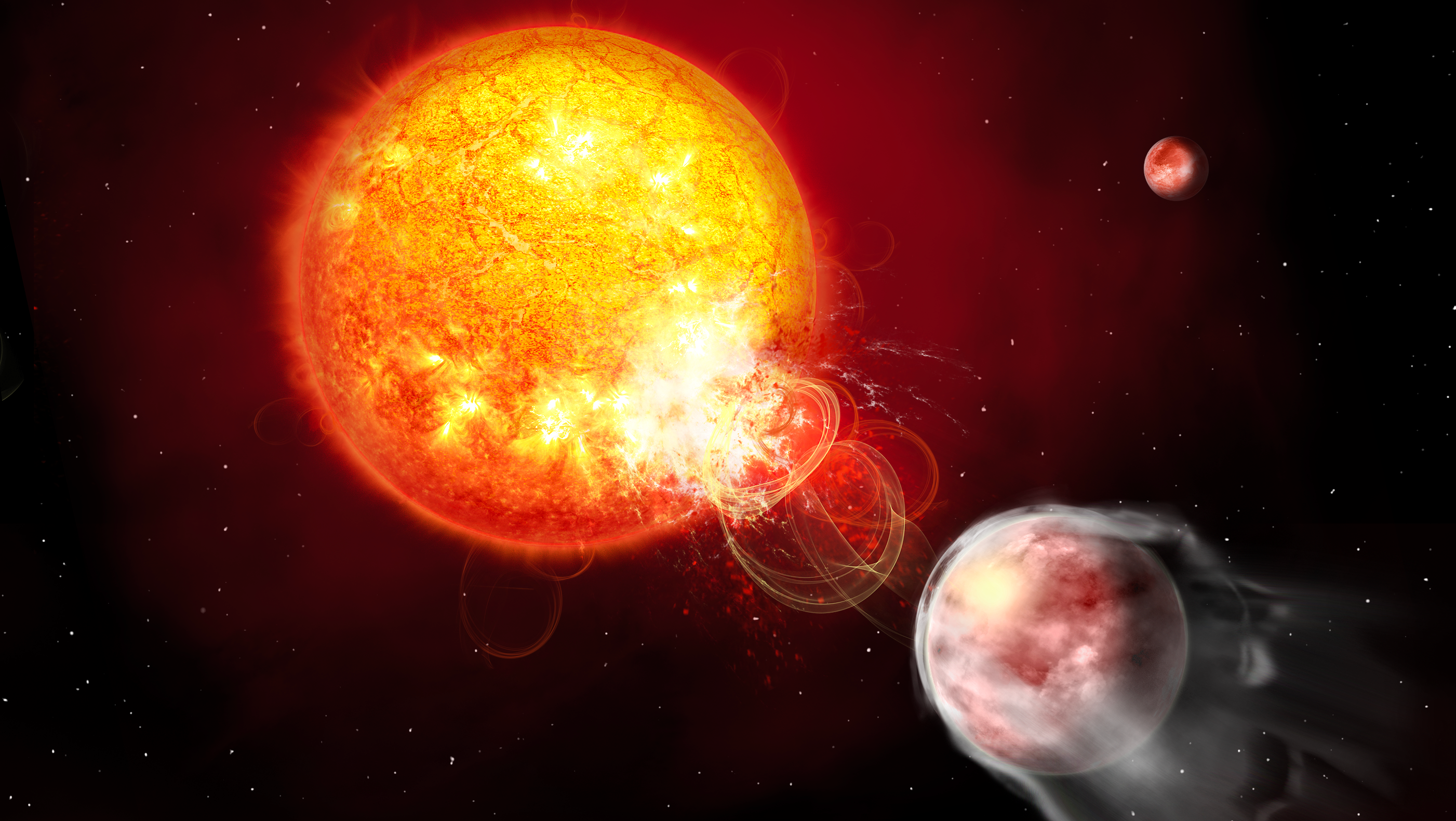 Esse exoplaneta, como são chamados os planetas fora do nosso Sistema Solar, orbita sua estrela tão de perto que parece desencadear erupções na superfície estelar — maiores do que qualquer uma já vista no Sol — que se estendem por milhões de quilômetros no espaço e, com o tempo, podem remover grande parte da atmosfera desse mundo azarado.