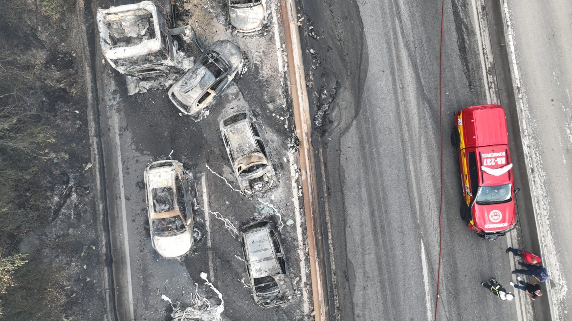 Entre o material que está sendo analisado pela equipe de especialistas da PRF estão imagens aéreas produzidas pelos policiais, assim que o fogo foi apagado. Policiais sobrevoaram a área com um drone para preservar com precisão o posicionamento dos veículos antes de qualquer interferência externa.