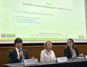 O professor Vinícius de Azevedo Couto Firme, do Departamento de Economia do campus Governador Valadares da Universidade Federal de Juiz de Fora (UFJF-GV), participou de um evento promovido pelo governo federal em Brasília, no dia 30 de junho último. O ‘1º Seminário do Novo Acordo do Rio Doce: Perspectivas e possibilidades para o desenvolvimento da região’ reuniu pesquisadores, autoridades políticas, representantes do judiciário e de movimentos sociais com o objetivo de discutir estratégias, desafios e oportunidades em relação às ações de responsabilidade da União no âmbito do acordo.