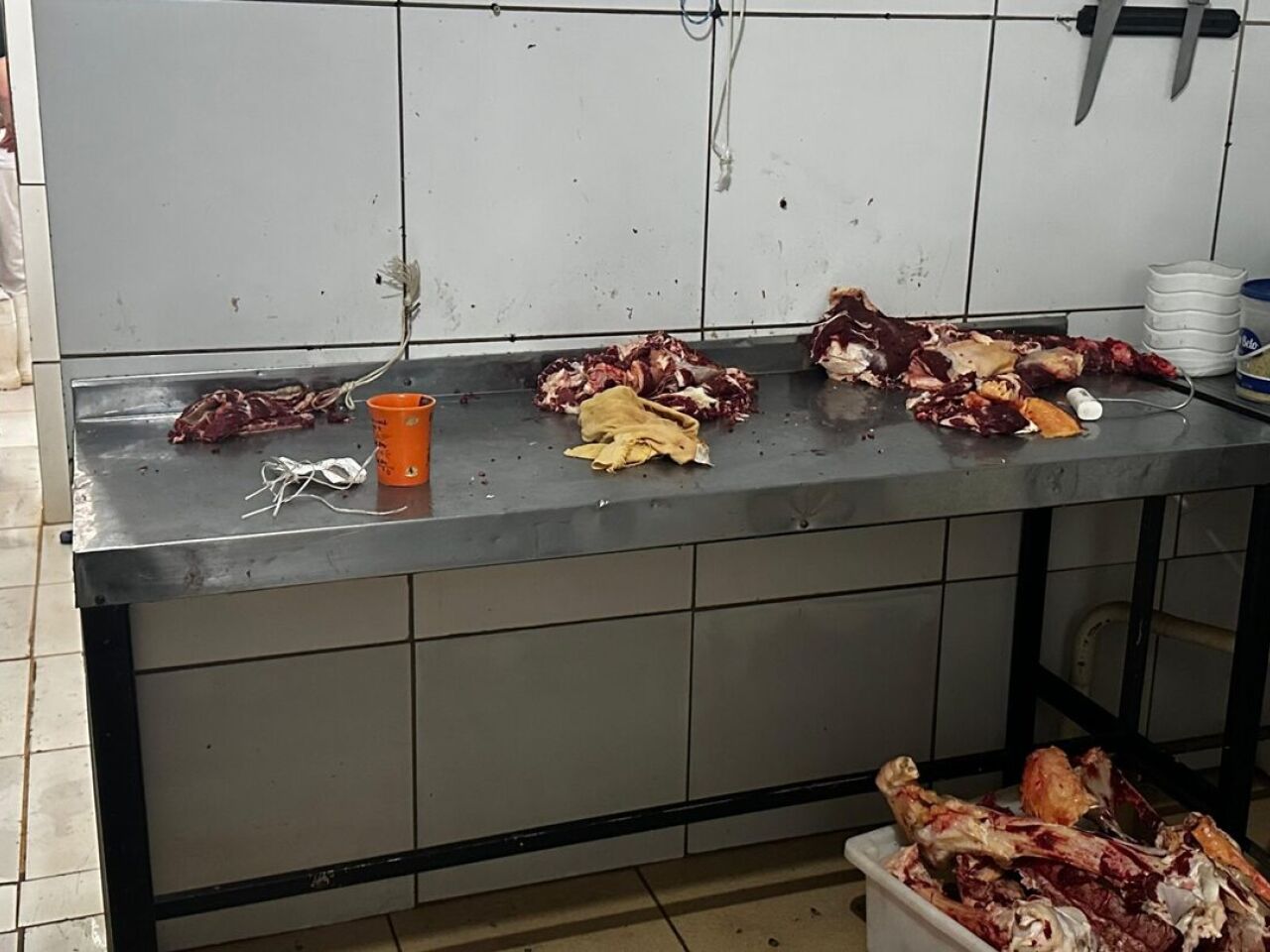 No estabelecimento comercial, os agentes encontraram cerca de 385 quilos de carne bovina e de frango armazenados de forma irregular. Também foi identificada a produção de linguiça sem inspeção ou informações de origem, sem rastreabilidade e em desacordo com as normas sanitárias.