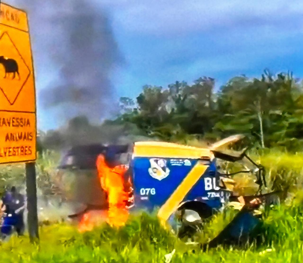 Após a interceptação, os assaltantes utilizaram explosivos para tentar abrir o cofre do carro-forte. O veículo ficou tombado à margem da rodovia e pegou fogo. Imagens registradas no local mostram chamas e intensa fumaça. Os vigilantes responsáveis pela escolta não ficaram feridos.