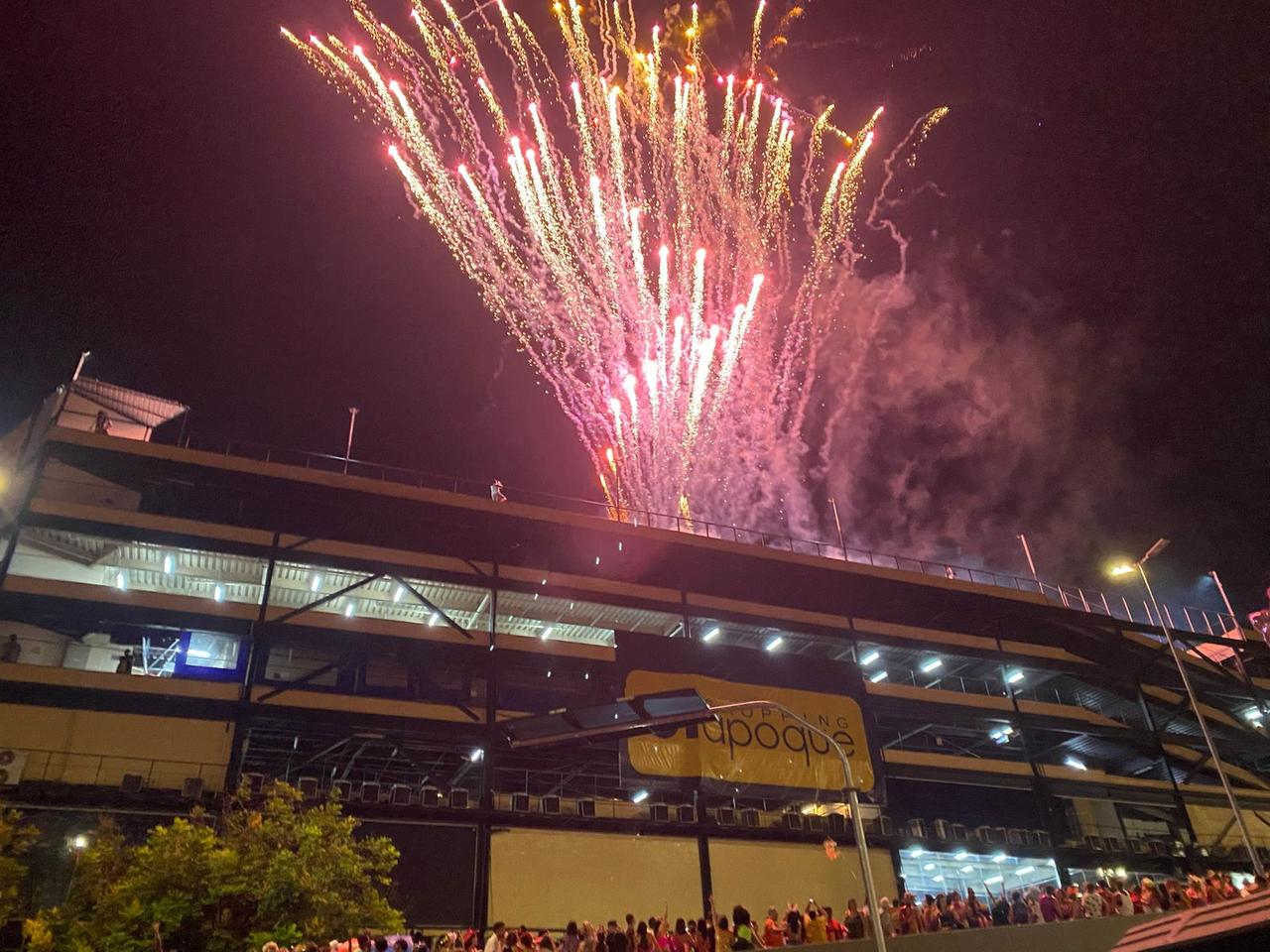 O show pirotécnico marcou o início do sábado de Carnaval, logo após o amanhecer na avenida do Contorno, próximo à rua Curitiba. A explosão de cores e o brilho dos fogos se misturaram à energia contagiante do bloco, que desde 2010 anima a capital mineira.