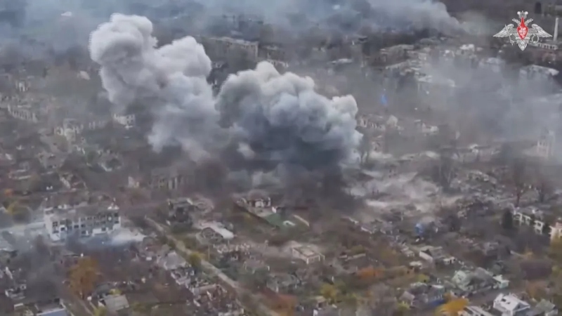 Um vídeo divulgado pelo Ministério da Defesa russo nesta segunda-feira (3) mostra o que a pasta diz ser a vila ucraniana de Rodynske sofrendo ataques aéreos.