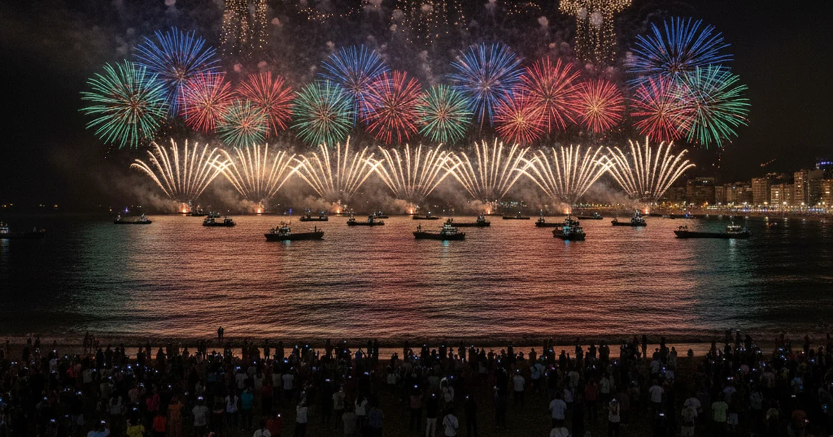 A tradicional queima de fogos durante o réveillon em Copacabana é uma das principais atrações do evento. Neste ano, o espetáculo terá 12 minutos de explosões pirotécnicas, partindo de 19 balsas posicionadas ao longo da praia — anteriormente, eram apenas 10 embarcações equipadas com os artefatos.