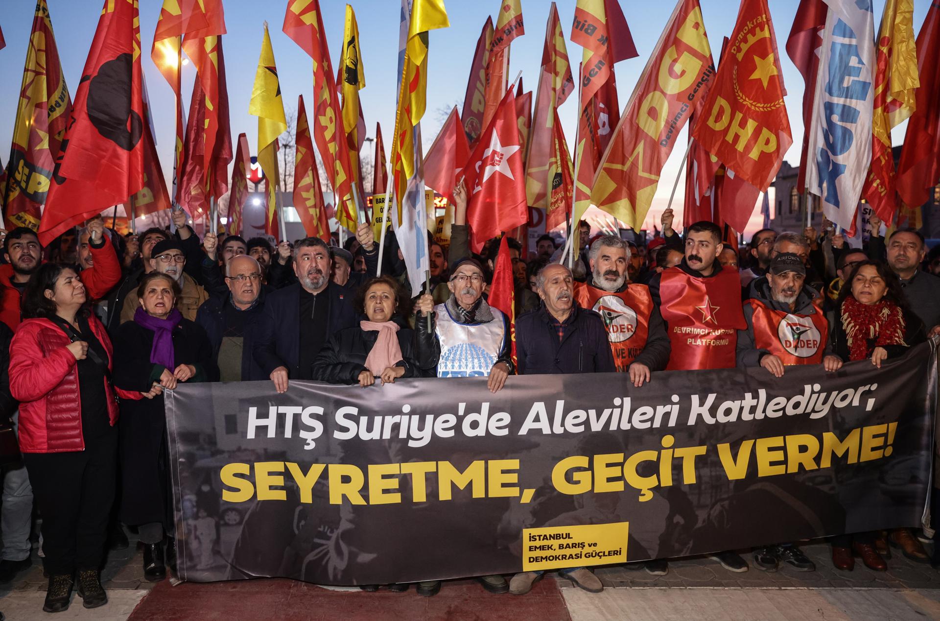 Manifestantes em Istambul, na Turquia, seguram uma faixa com a mensagem “HTS massacra alauítas na Síria, não fiquem parados, não permitam a impunidade”, nesta segunda-feira (10) (Foto: EFE/EPA/ERDEM SAHIN)