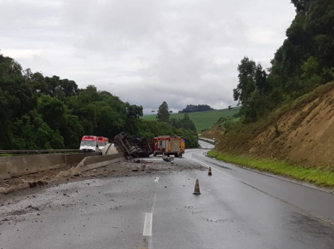 Segundo a Polícia Rodoviária Federal (PRF), o caminhão estava carregado com nafta e há risco de explosão. Corpo de Bombeiros e Instituto Água e Terra foram acionados e não há prazo para liberação da rodovia.