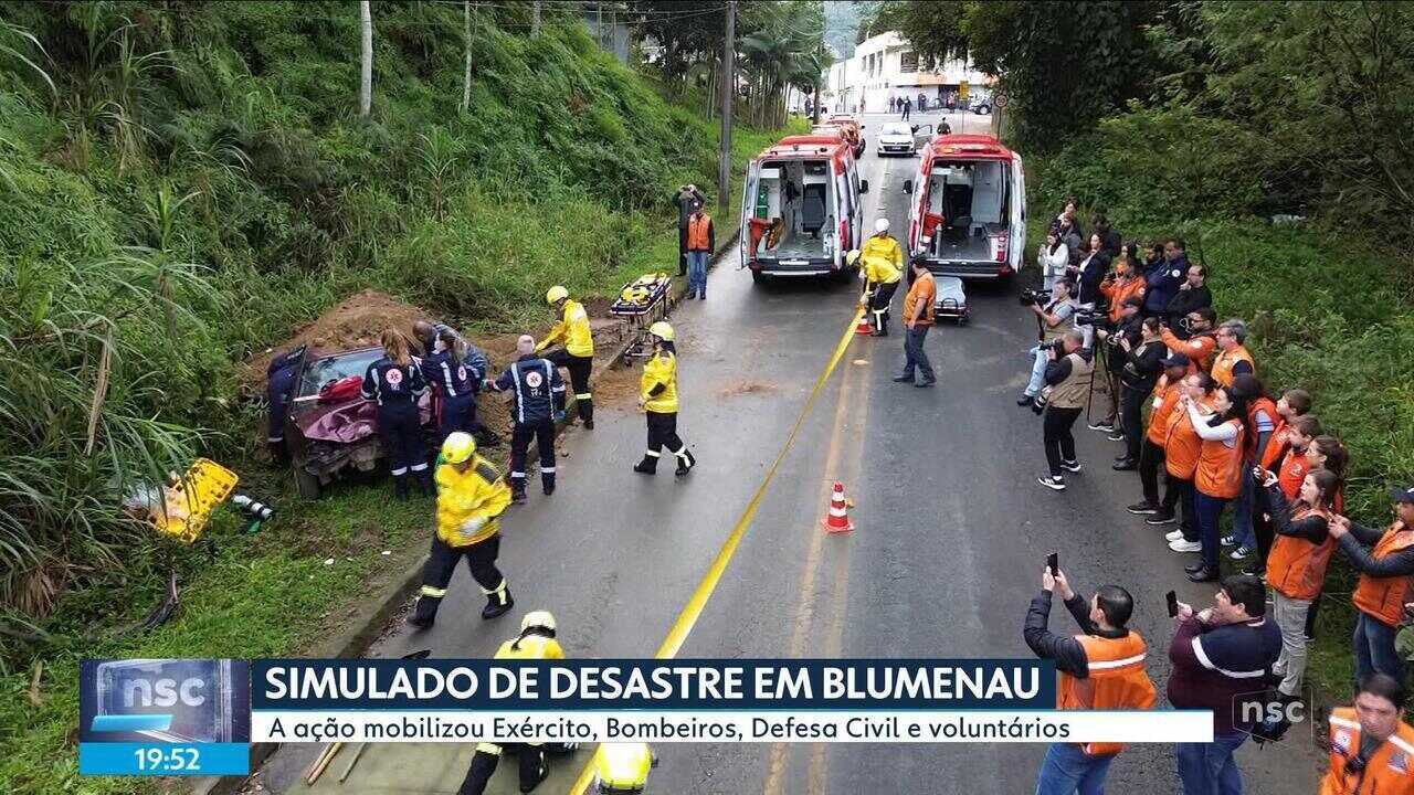 Um simulado de desastre mobilizou Exército, Bombeiros, Defesa Civil e voluntários em Blumenau.