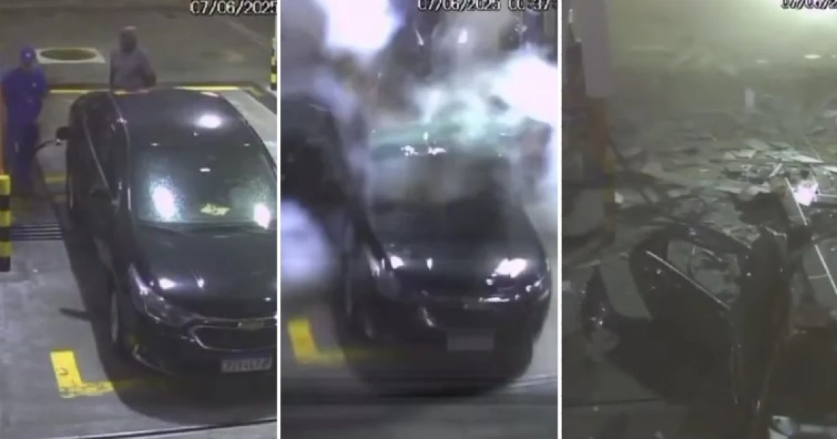 O acidente aconteceu enquanto o carro era abastecido com gás natural veicular (GNV). A força da explosão fez com que o veículo ficasse em pedaços e fosse arremessado alguns metros à frente.